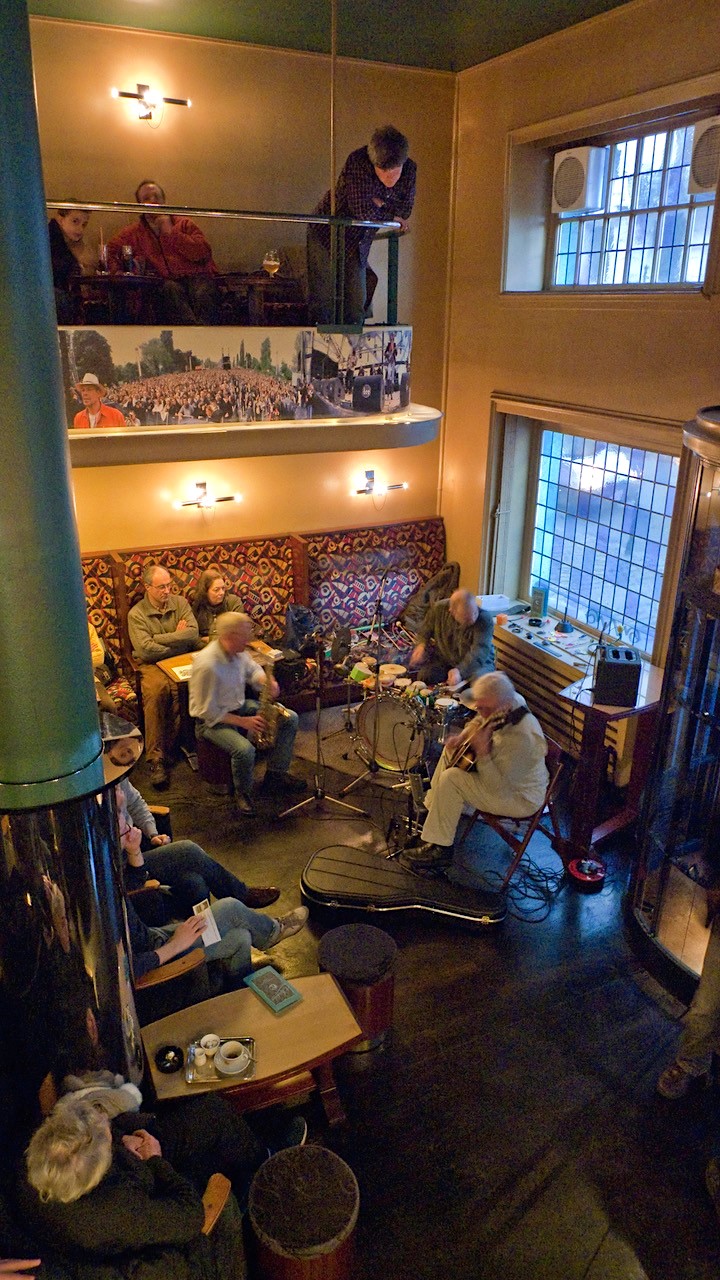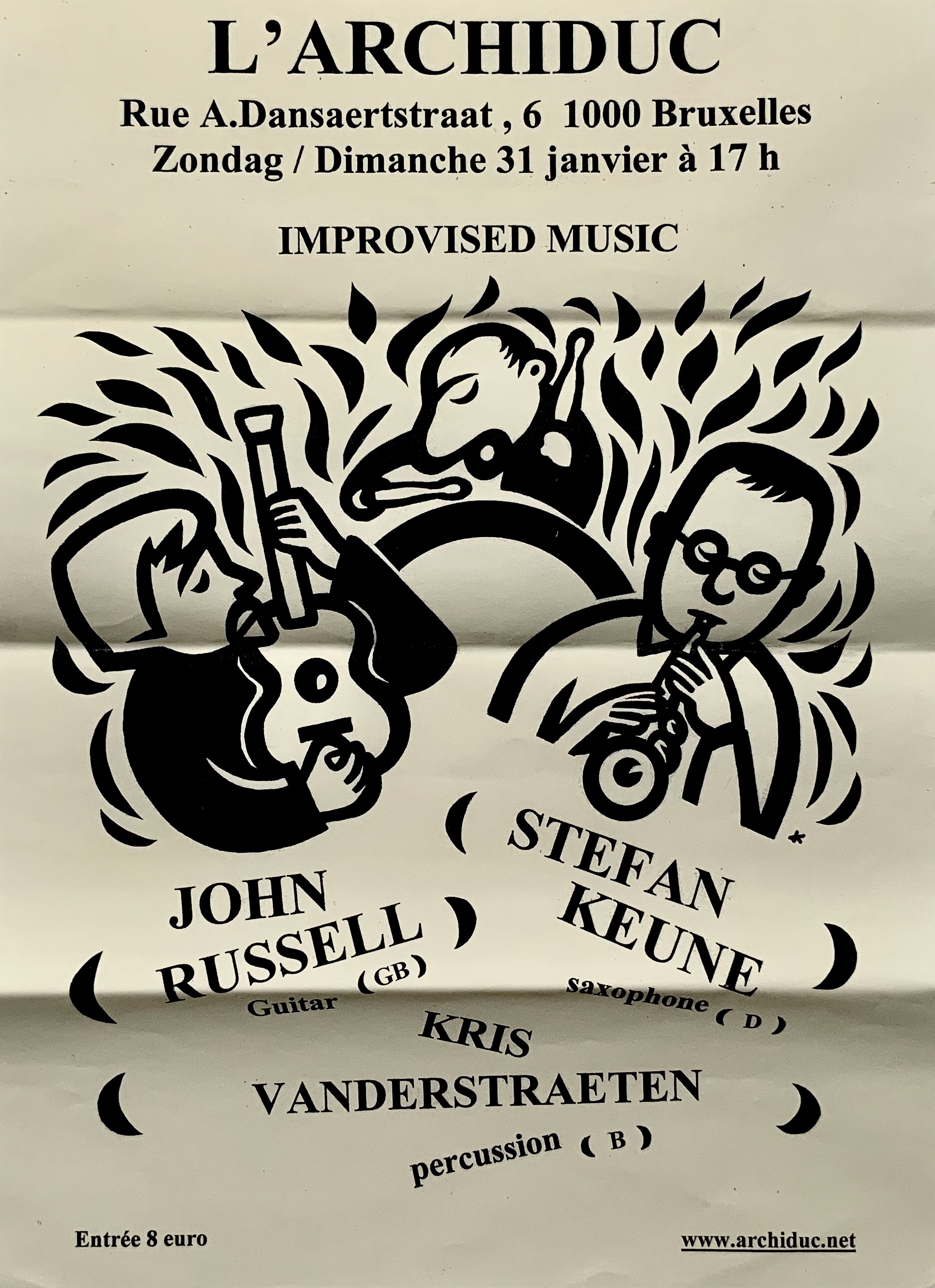 One of our new releases is the excellent live concert the great John Russell, Stefan Keune and Kris Vanderstraeten did at L’Archiduc in Brussels (Belgium). Here’s a beautiful action photo by Daniël Van Acker. The poster scan, a design by Kris Vanderstraeten himself, is courtesy of Stefan Keune. Available from our store.