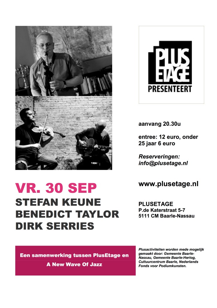 Next week’s label-affiliated musicians STEFAN KEUNE (sax), BENEDICT TAYLOR (viola) and DIRK SERRIES (archtop guitar) are playing our 5th label event at jazzclub PlusEtage (Baarle-Nassau, The Netherlands). While Benedict and Dirk know each other pretty well, from the numerous concerts and albums, this is the first time they join musical forces with German saxophonist STEFAN KEUNE. Not to be missed.