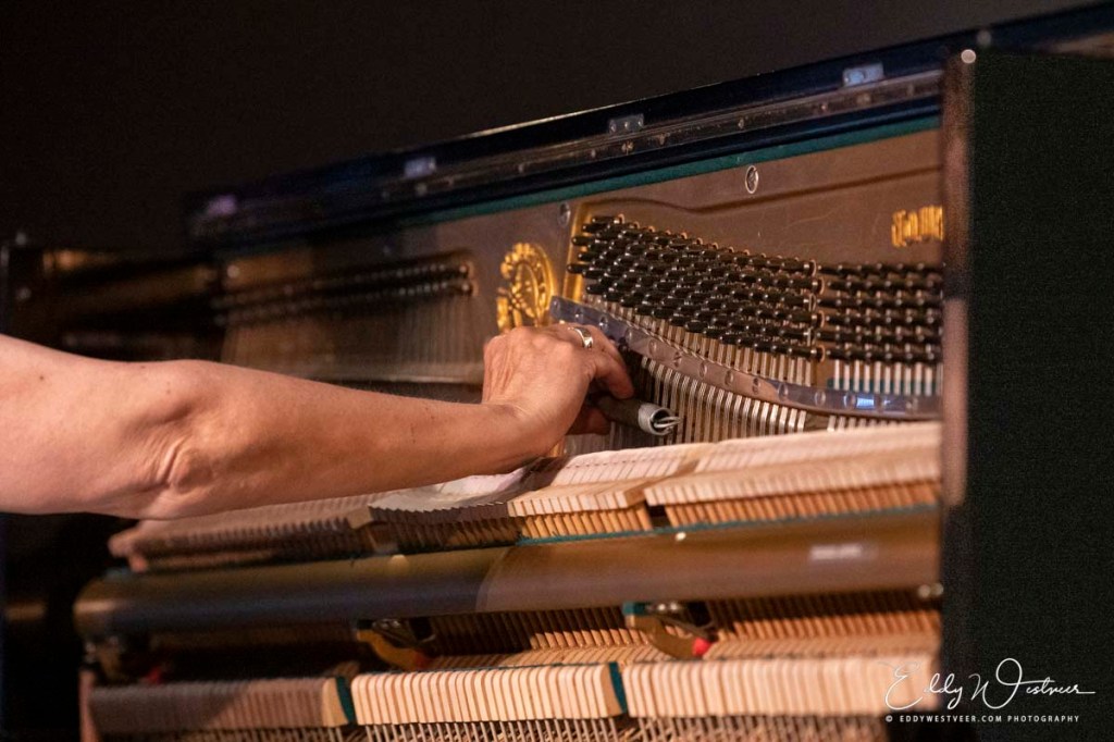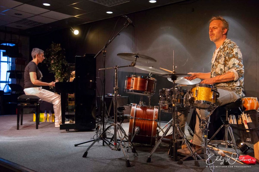 Verhoeven beroerde de snaren van de standing piano vooralsnog zonder de witzwarte toetsen te raken. Verbruggen trommelde wat en rommelde wat achter zijn kit op zoek naar een vorm van harmonie. Beiden zijn bezig met ritmiek en zoeken verbinding. Ze voelen elkaar goed aan zonder één moment oogcontact of onderliggende afspraken. Go with the flow. Of juist de uitdaging zoeken en elkaar prikkelen. De ramen van de zaal staan open. De altijd in de zomeravond aanwezige merels mengen zich ongevraagd in het gesprek. Ook de kerkklokken van Baarle-Nassau en Baarle-Hertog laten zich niet onbetuigd. Drummer en pianist toonden dynamiek en kleurden beiden lekker buiten de lijntjes. De overgang van rustig naar een onweersachtige dreiging kon ook verrassend abrupt gaan. Dan: een klein moment van oogcontact en het is pauze!