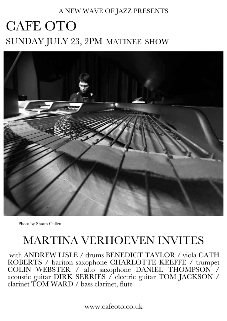 Pianist MARTINA VERHOEVEN has been part of the label since day one. Over the years she played together with a significant number of outstanding UK musicians so naturally when there’s something to be celebrated, the decision is easily made to do this in London, one of the main hubs in the UK for the free improvised Martina and we, as the label, like so much. Tomorrow she, along with guitarist DIRK SERRIES, is surrounded by this stellar line-up of UK musicians: ANDREW LISLE (drums), BENEDICT TAYLOR (viola), CATH ROBERTS (baritone sax), CHARLOTTE KEEFFE (trumpet, flugelhorn), COLIN WEBSTER (alto sax), DANIEL THOMPSON (acoustic guitar), TOM JACKSON (clarinet) and TOM WARD (bass clarinet, flute). For this special event artist GINA SOUTHGATE, renowned for her live concert paintings, will capture the full band on canvas.
