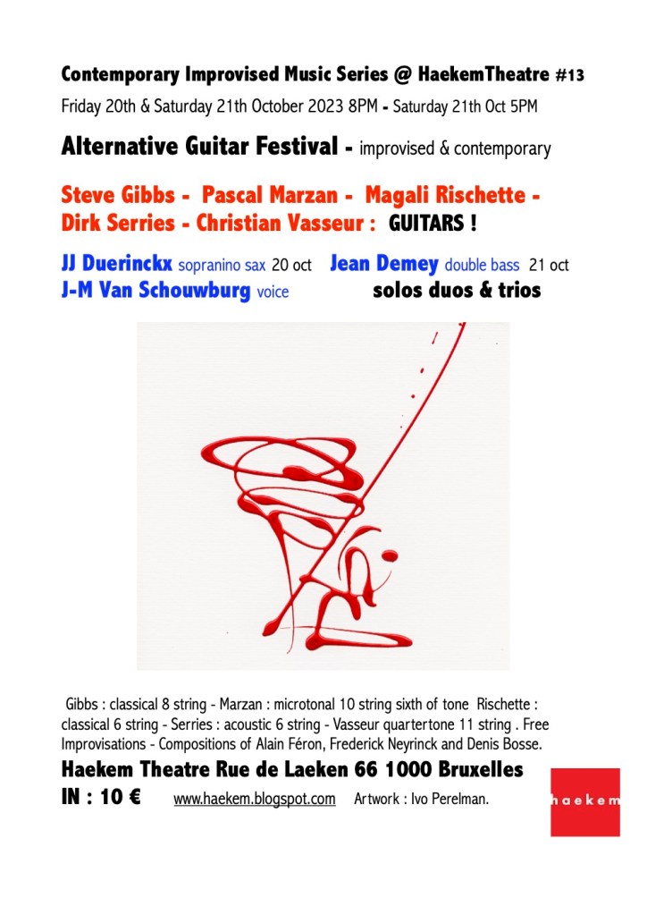 Impro vocalist and free jazz connaisseur JEAN-MICHEL VAN SCHOUWBURG invited DIRK SERRIES for his 2-day alternative guitar festival at Haekem Theatre in Brussels. Tonight and tomorrow Dirk will perform solo as well in some ad-hoc configurations, among the likes of Pascal Marzan, Christian Vasseur, Steve Gibbs and Magali Rischette.