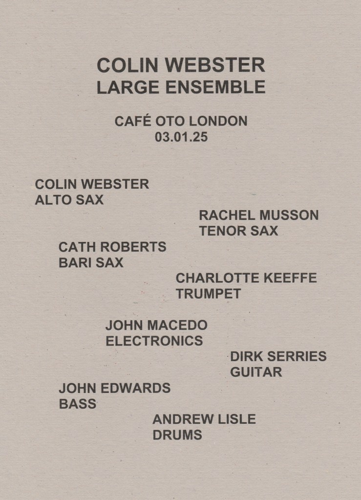 Tonight, for the third time, the impressive COLIN WEBSTER LARGE ENSEMBLE is playing Cafe Oto (London). After two previous passages and their related releases (‘First Meeting’ and ‘Second Edition’) on Raw Tonk Records, they are re-gathering for an early 2025 live performance. Get ready for some on the edge live improvisation.