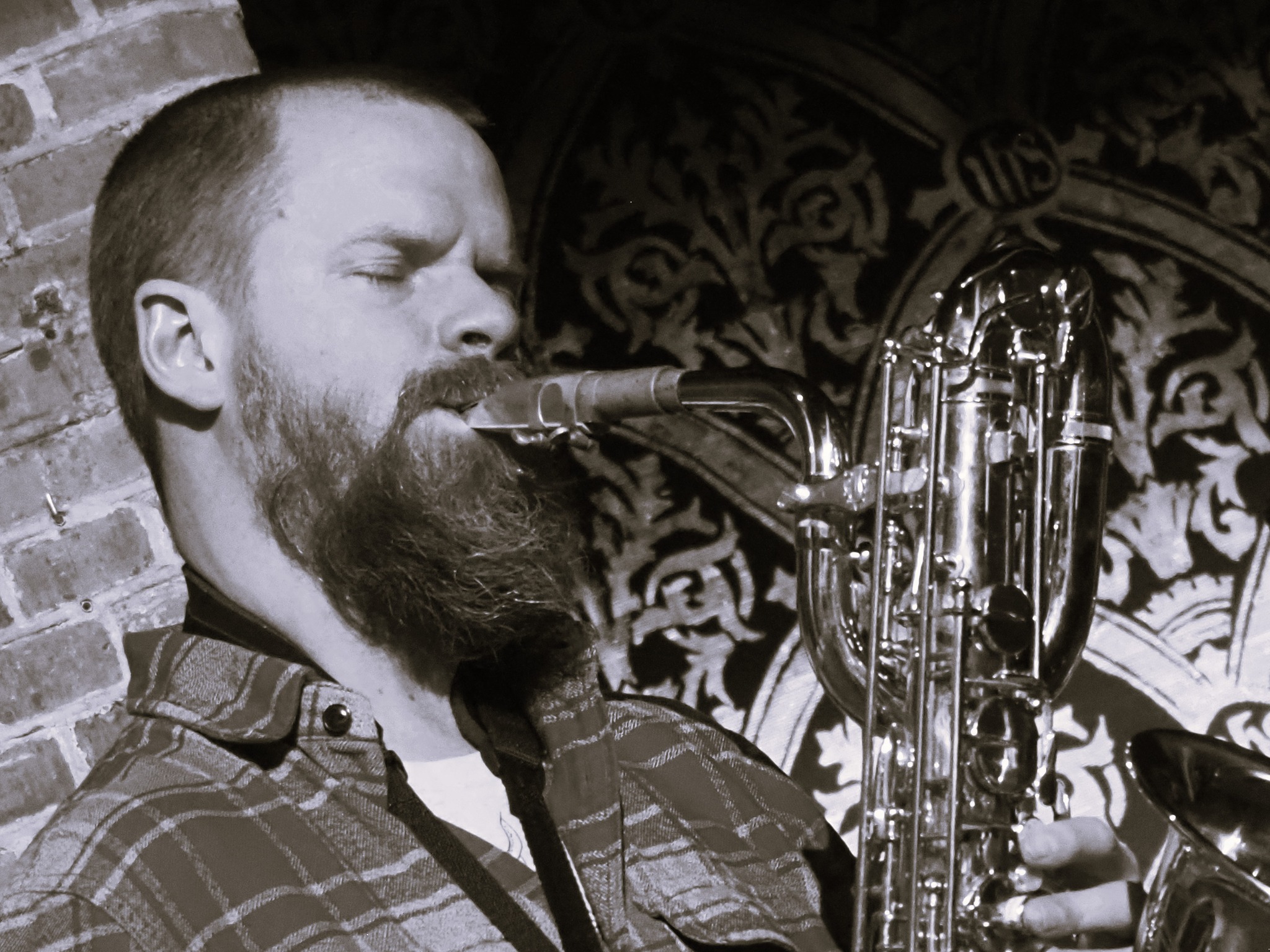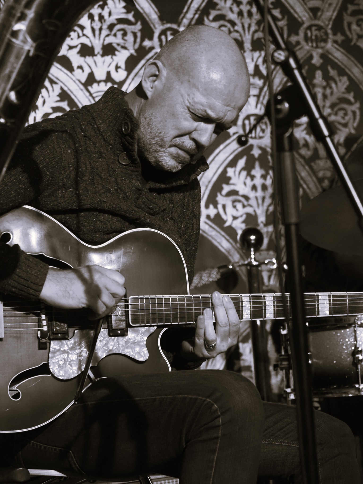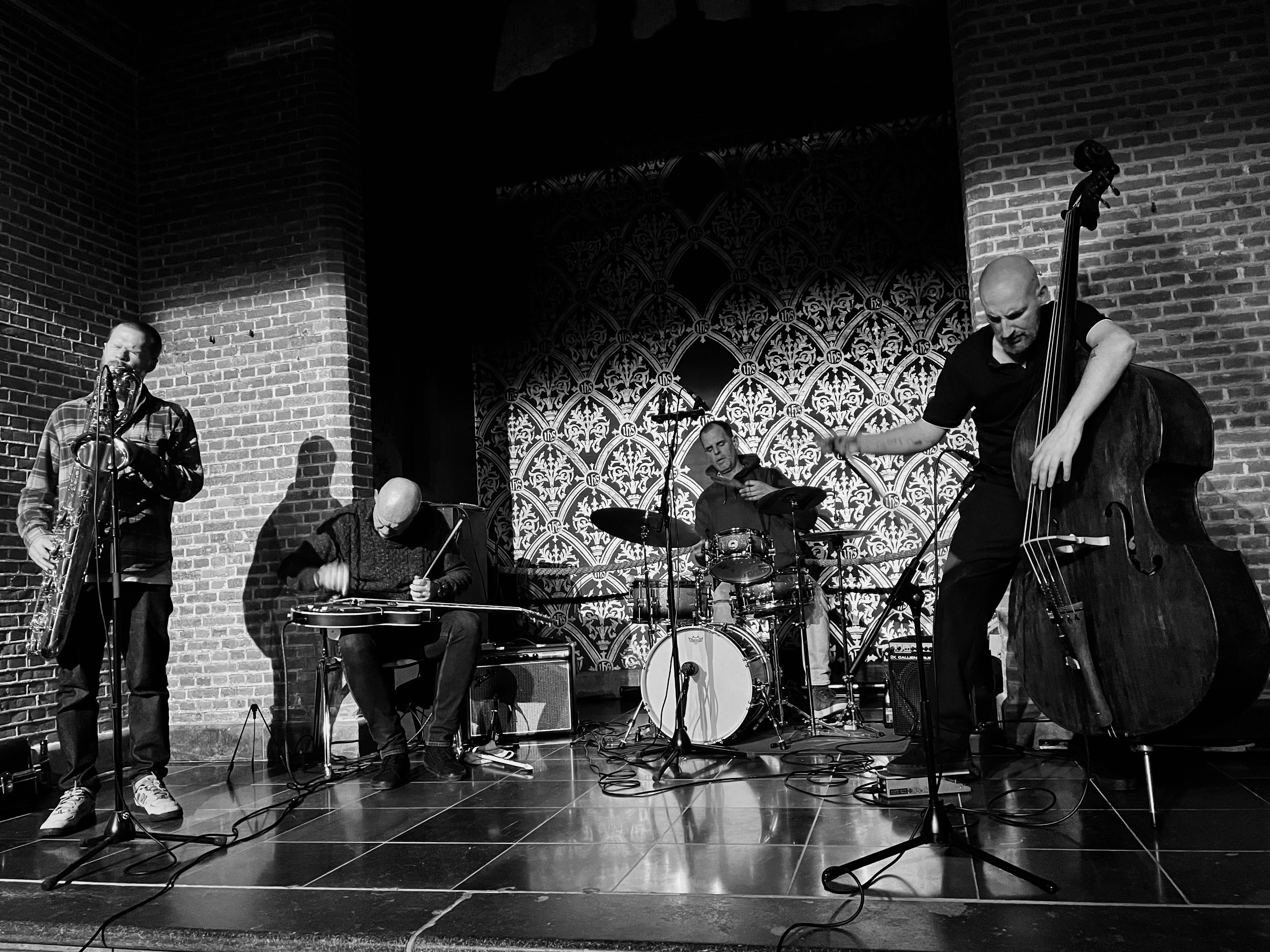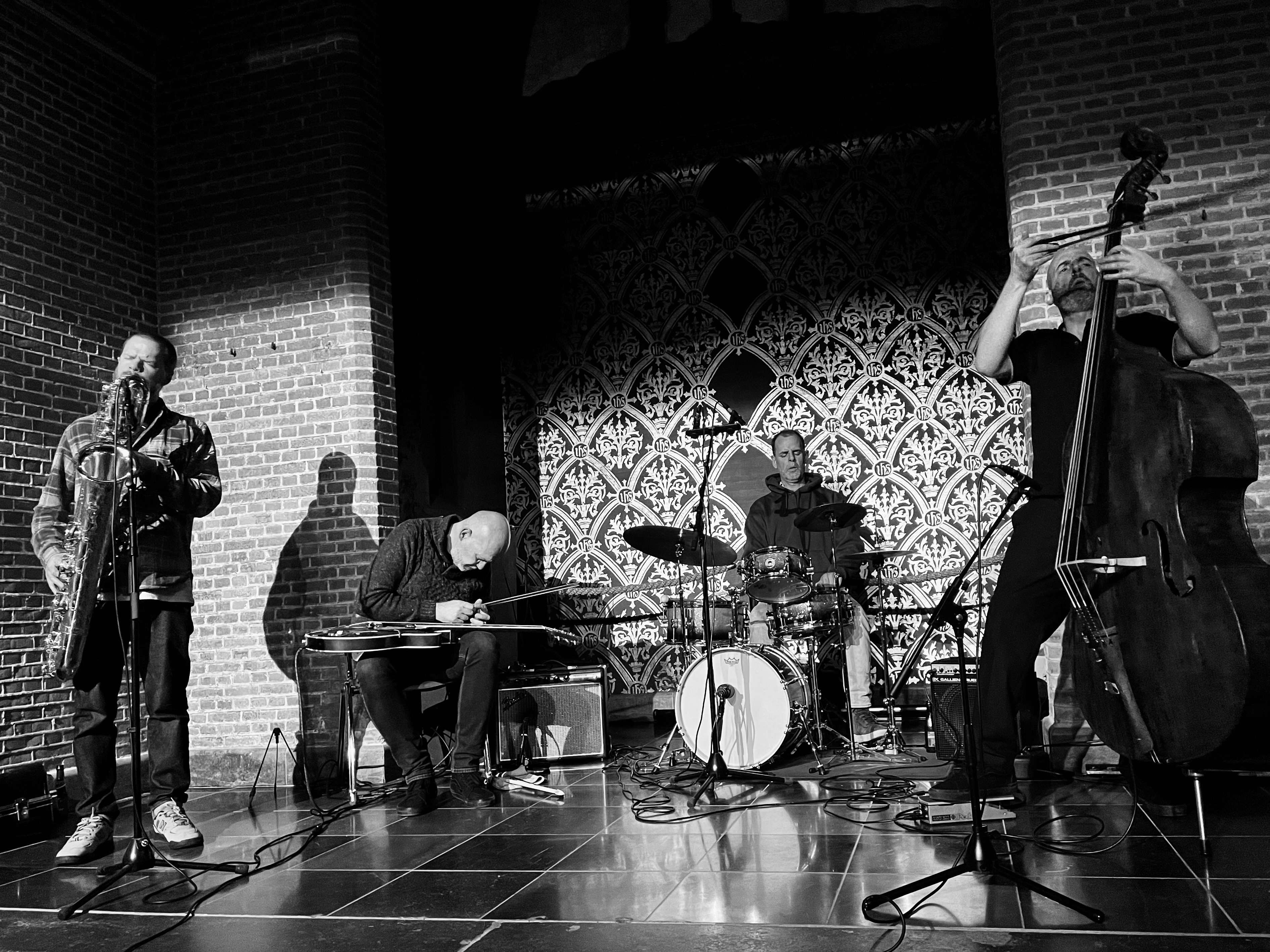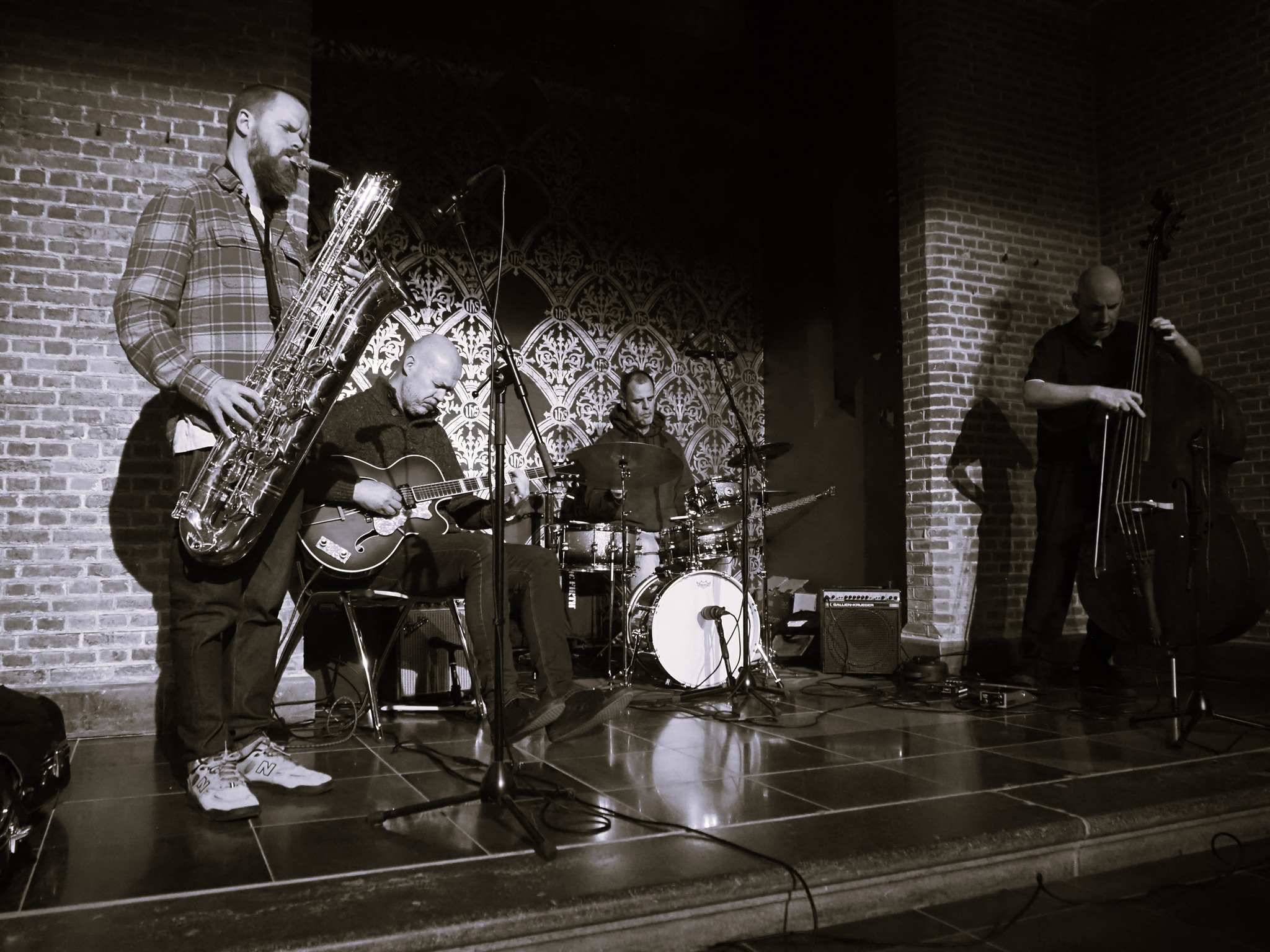 Last Friday we organised a concert of a fine new quartet bringing together COLIN WEBSTER (on baritone saxophone), DIRK SERRIES (on archtop guitar), PHILIPP ERNSTING (on drums) and GONÇALO ALMEIDA (on double bass) at the beautiful chapel in Brecht. This quartet is a keeper. Here are some lovely photos from the show, courtesy of Jan Kees Helms and Jef Vandebroek.