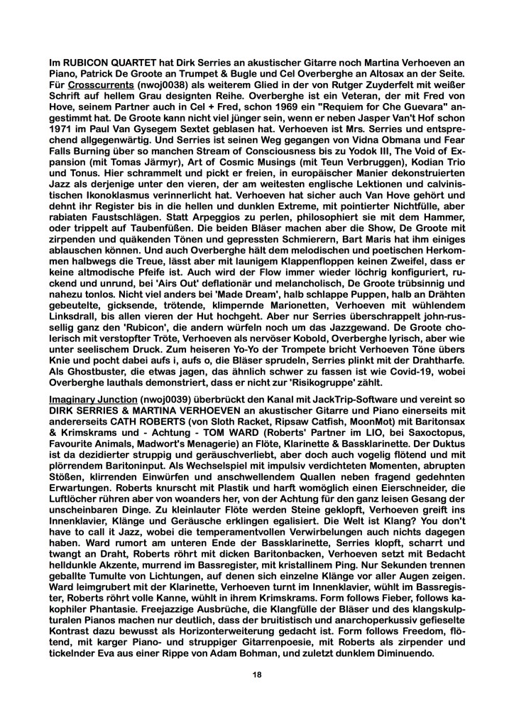“Zmieniamy klimat gatunkowy (to dziś reguła!) i przynosimy się do … dwóch miejsc jednocześnie! Martina Verhoeven (fortepian) i Dirk Serries (gitara akustyczna) znajdują się w belgijskim Sint-Lenaarts, zaś Cath Roberts (saksofon barytonowy, obiekty) i Tom Ward (flet, klarnet, klarnet basowy) w angielskim Brockley. Obie pary połączone są globalną siecią i aplikacją JackTrip, dzięki czemu słyszą się (i pewnie widzą) w czasie niemal rzeczywistym. Wspólnie zatem improwizują, mimo, iż znajdują się po przeciwległych stronach kanału oddzielającego Imperium Brytyjskie od Starego Kontynentu. W samym środku pandemicznego lata 2020 owa zdalna free impro trwa godzinę zegarową i kilkanaście sekund, a na płycie składa się z dwóch części.