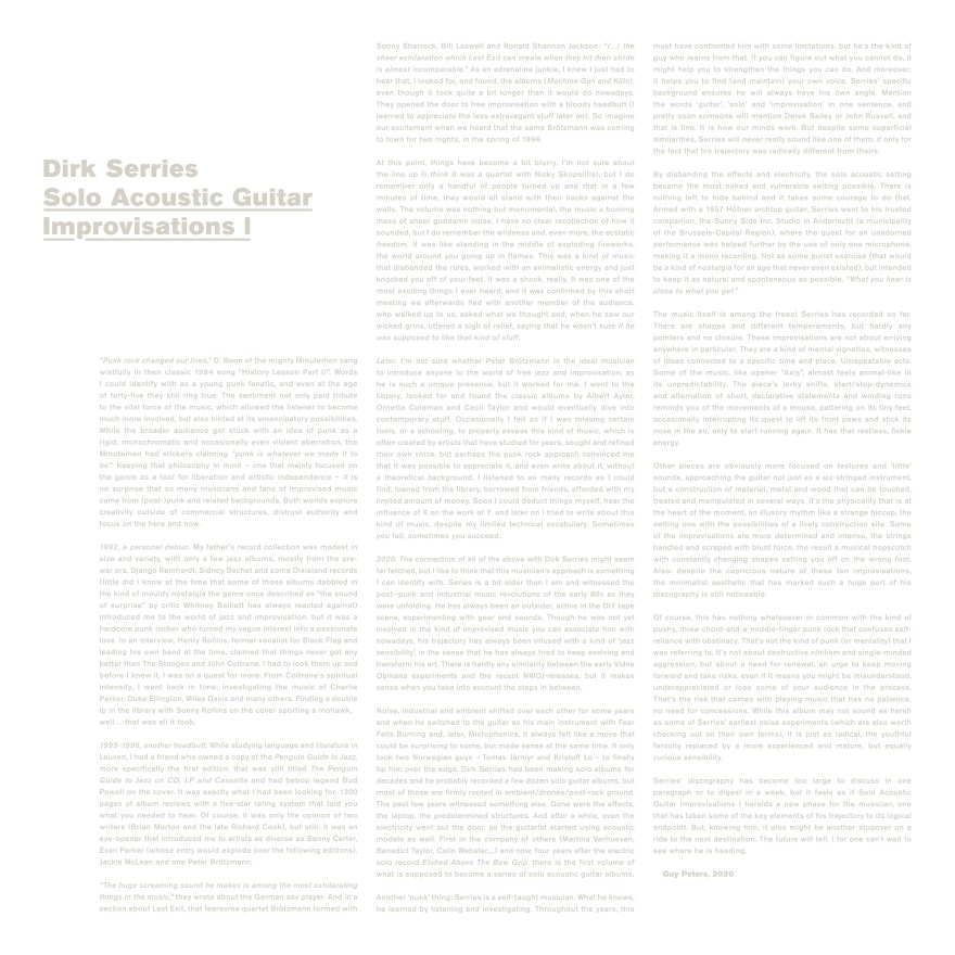 ‘Solo Acoustic Guitar Improvisations’ is een totaal ander album, al was het maar omdat je met een onversterkte akoestische gitaar natuurlijk nooit die klankwolken kunt produceren als op de vorige twee albums. Maar er is meer aan de hand: dit album past namelijk perfect bij de nieuwe weg die Serries de afgelopen jaren heeft gelopen, richting de vrije improvisatie en die op dit A New Wave of Jazz volop aan bod komt. Het was dan ook een kwestie van tijd voordat Serries in deze stijl met een soloalbum zou komen. In tien miniaturen verkent hij zijn instrument en de mogelijkheden tot het realiseren van een onverwacht klankspectrum. En dat hij zich daarbij niet beperkt tot traditionele speltechnieken zal u niet verbazen. Neem ‘Grid’ waarin Serries op vervaarlijke wijze de snaren onder handen neemt, ‘Cluster’ waarin hij op benijdenswaardige wijze hermetische patronen te voorschijn tovert en ‘Factor’ waarin alles piept en kraakt. Kortom het betreft hier een weerbarstig album waarin Serries op zoek gaat naar een geheel nieuwe definitie van het begrip schoonheid, één die mij overigens prima bevalt.” Nieuwe Noten – The Netherlands